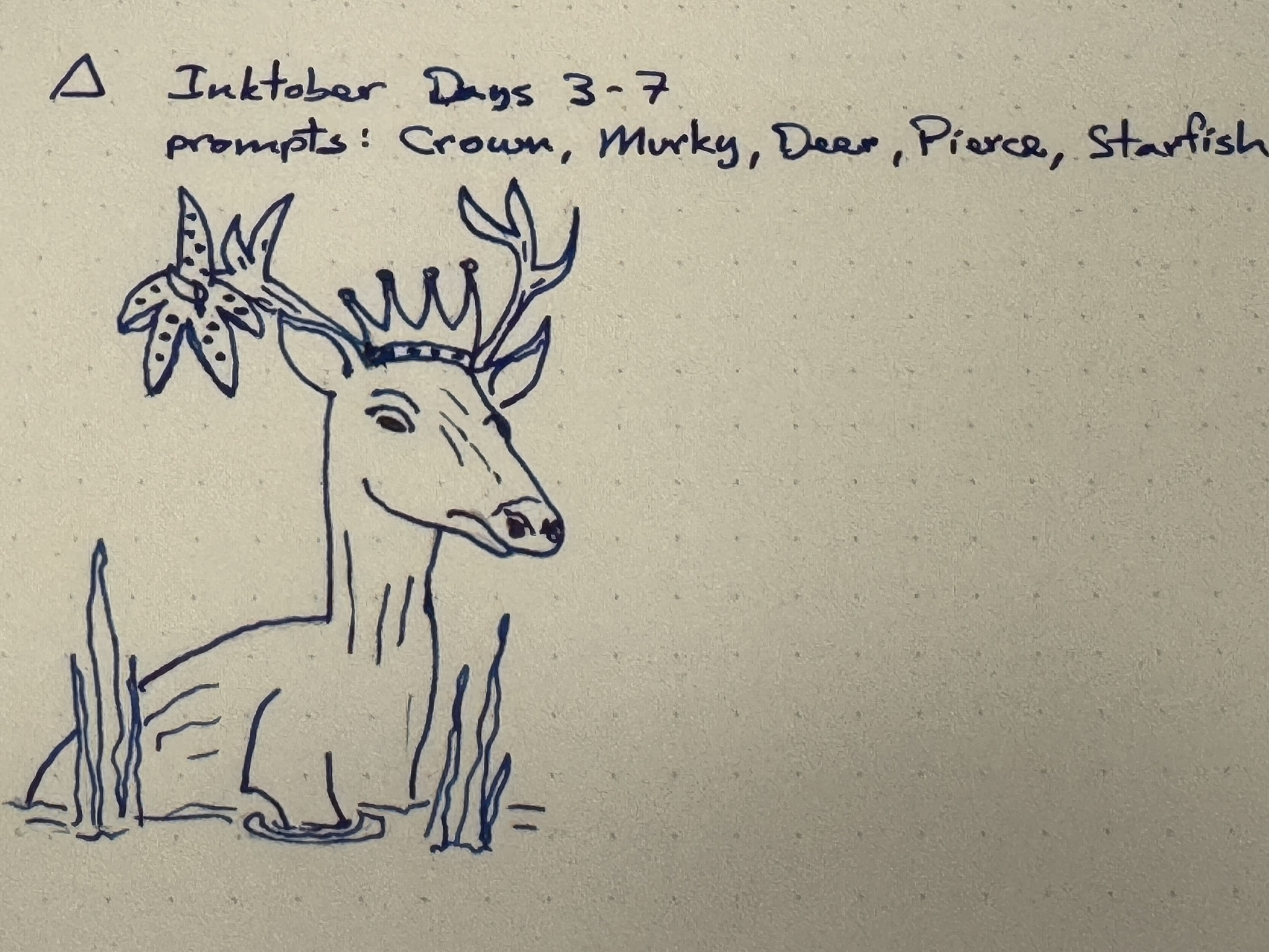 2025I missed a few days of #inktober. I took some time today to catch up. But rather than do a bunch of separate drawings for the prompts for days 3 - 8 (crown, murky, deer, pierce, and starfish) I decided to combine them into one pic. So here’s a deer wearing a crown, stuck in a murky swamp, and has pierced a starfish on its antlers.